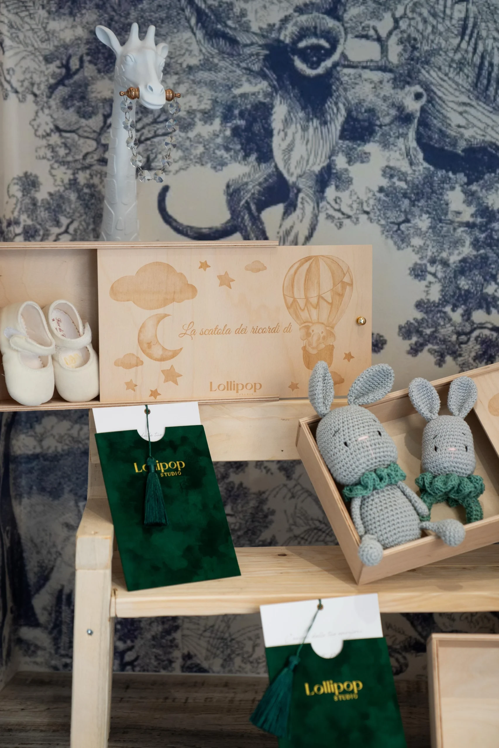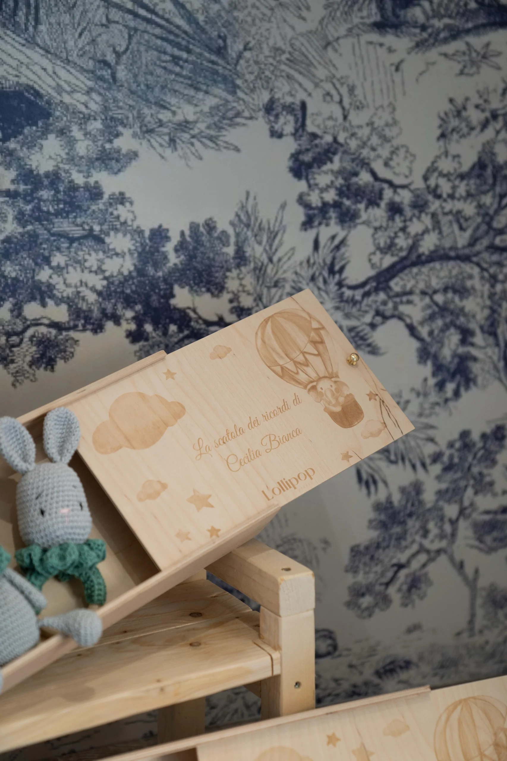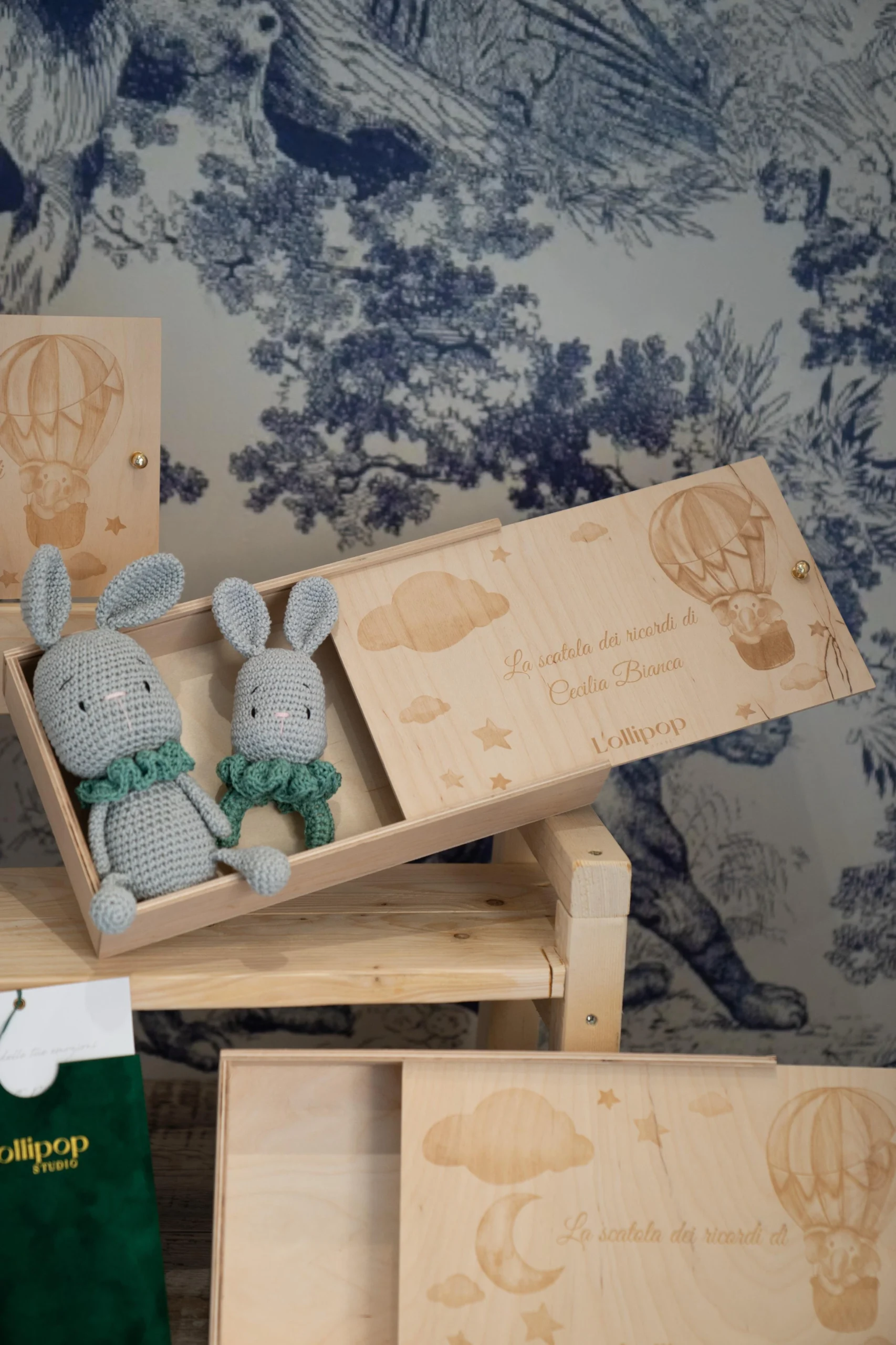 Da questa emozione nasce la Scatola dei Ricordi, un cofanetto artigianale in legno, personalizzato con l’incisione del nome del tuo bambino.